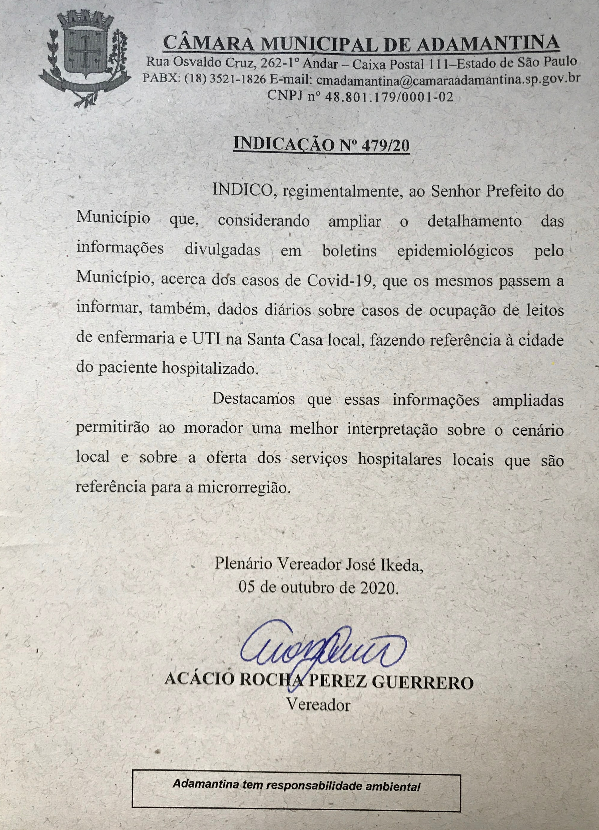 O maior detalhamento sobre os casos de Covid-19, em Adamantina, com informações sobre a ocupação de leitos de enfermaria e UTI na Santa Casa local foi pedido pelo vereador Acácio Rocha, de 5 de outubro, por meio da Indicação Nº 479/2020. “Essas informações ampliadas permitirão ao morador uma melhor interpretação sobre o cenário local e sobre a oferta dos serviços hospitalares locais que são referência para a microrregião”, diz o documento. Veja a íntegra do pedido: