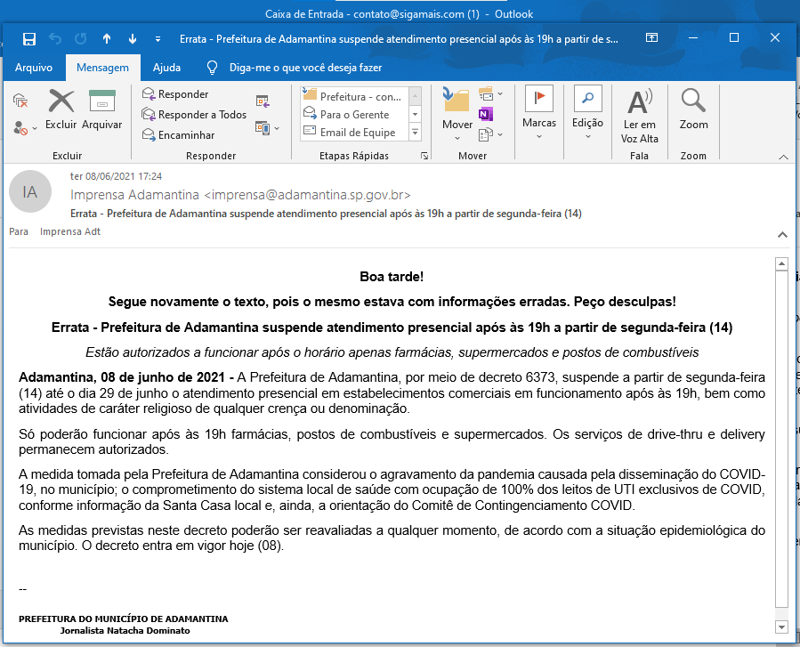 Na tarde desta terça-feira a Prefeitura de Adamantina divulgou três notas sobre a mudança no horário limite para atendimento presencial nos estabelecimentos comerciais e religiosos da cidade. Após a divulgação do primeiro texto, às 16h06, foi enviada uma errata à imprensa, com a segunda versão, às 16h33, com alterações. E, por fim, uma terceira versão, às 17h24, com a mudança de início de vigência do decreto municipal (veja o decreto com a nova data).