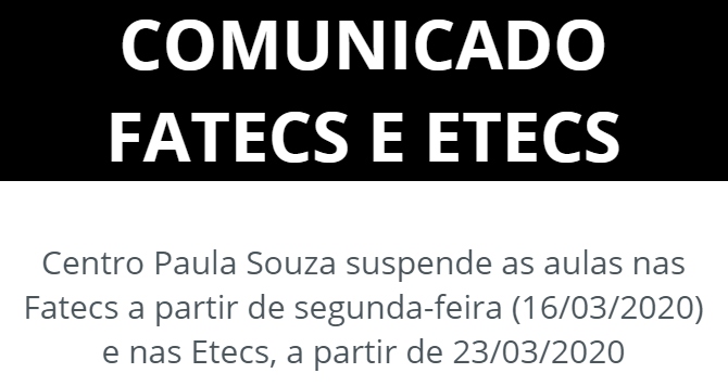 Em comunicado divulgado pelo Centro Paula Souza (CPS), foram seguidas as recomendações do Governo do Estado de São Paulo para a suspensão temporárias de aulas e outras atividades com púbico superior a 500 pessoas, face à pandemia de coronavírus (Covid-19).