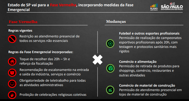 Com o retorno à fase vermelha, São Paulo volta a permitir a retirada de produtos pelo consumidor diretamente nos locais de venda, como comércios, restaurantes e outras atividades, Porém, o atendimento presencial e venda no local continuam proibidos em todos os estabelecimentos.