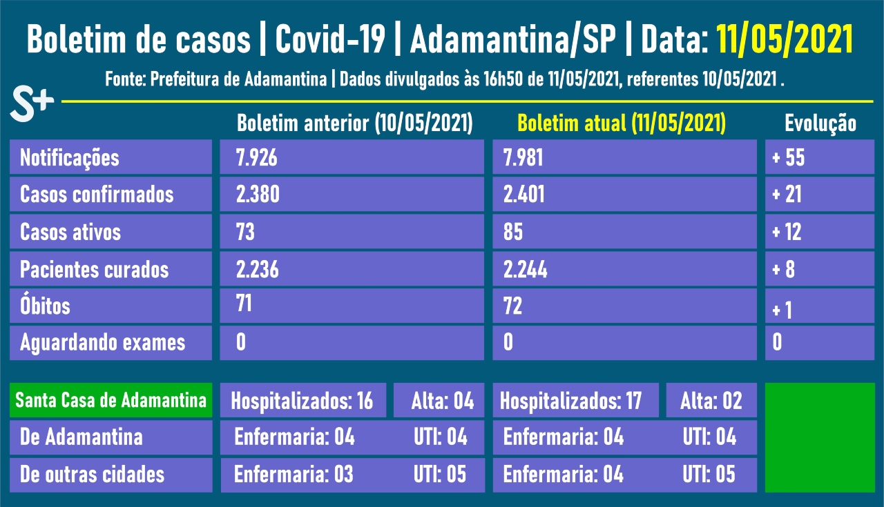 Em relação à ocupação hospitalar, a Santa Casa de Adamantina tem 17 pacientes hospitalizados nas alas de isolamento para Covid-19, dos quais 8 são de Adamantina. Desses, 4 estão na enfermaria e 4 na UTI. De outras cidades são 9 hospitalizados, dos quais 4 na enfermaria e 5 na UTI. O boletim informa que 2 pacientes receberam alta hospitalar.