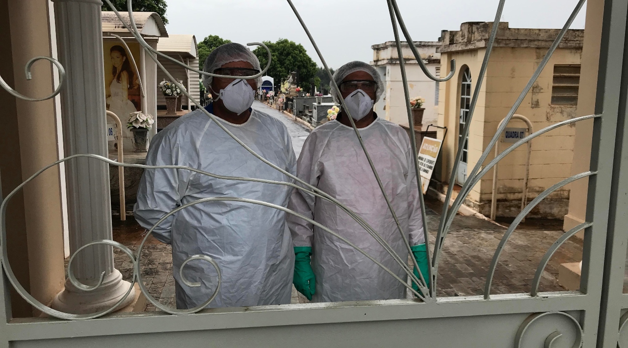 Trabalhadores do cemitério paramentados para sepultamentos com protocolo para Covid (Aquivo: Siga Mais)