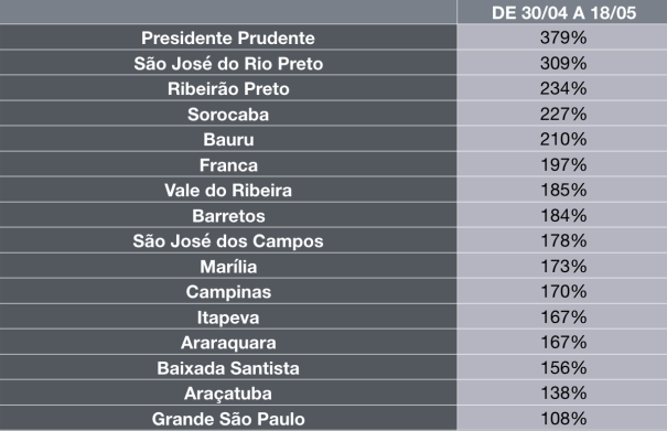 Nas demais regiões administrativas, a taxa de aumento de casos foi maior: Presidente Prudente (379%), São José do Rio Preto (309%), Ribeirão Preto (234%), Sorocaba (227%), Bauru (210%), Franca (197%), Vale do Ribeira (185%), Barretos (184%), São José dos Campos (178%), Marília (173%), Campinas (170%), Itapeva (167%), Araraquara (167%), Baixada Santista (156%) e Araçatuba (138%).