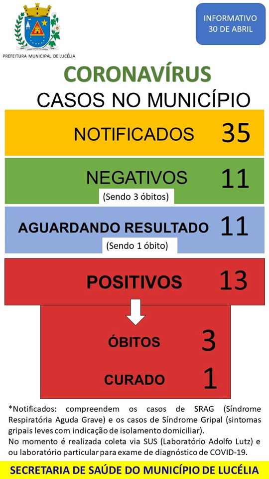 Agora, são 13 casos positivos, dos quais três moradores foram a óbito e um se recuperou no tratamento e foi curado da doença. No boletim de quarta-feira (29) eram 9 os casos positivos na cidade. O primeiro caso em Lucélia foi divulgado no dia 18 de abril. (Continua após a publicidade...)