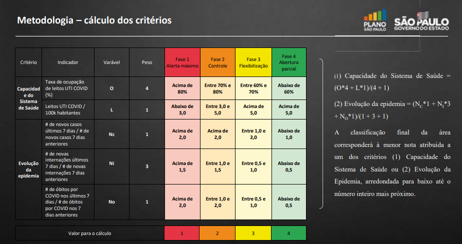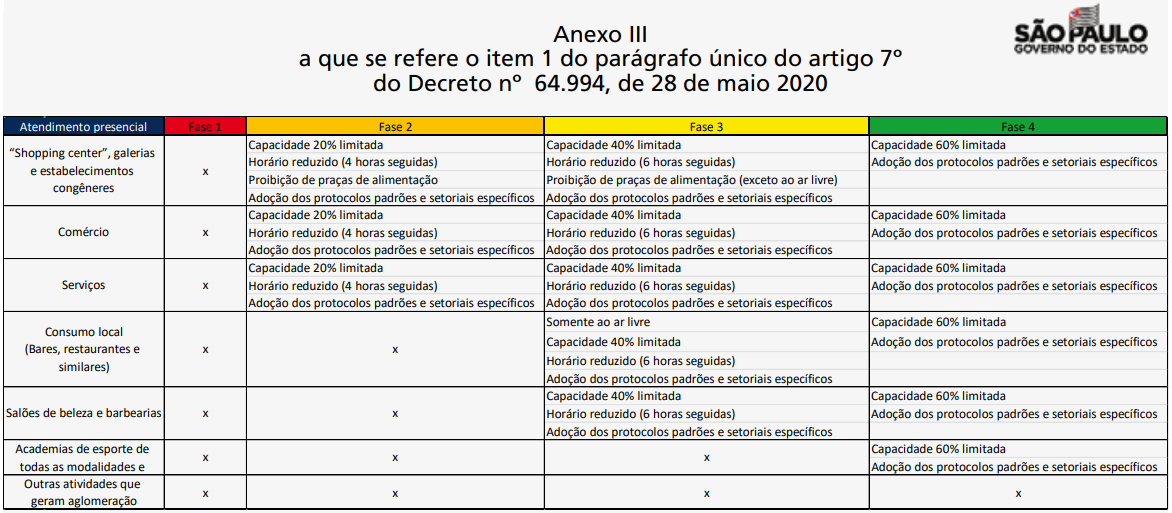 • Cada região poderá reabrir determinados setores de acordo com a fase em que se encontra. As regras são: média da taxa de ocupação de leitos de UTI exclusivas para pacientes com coronavírus, número de novas internações no mesmo período e o número de óbitos.