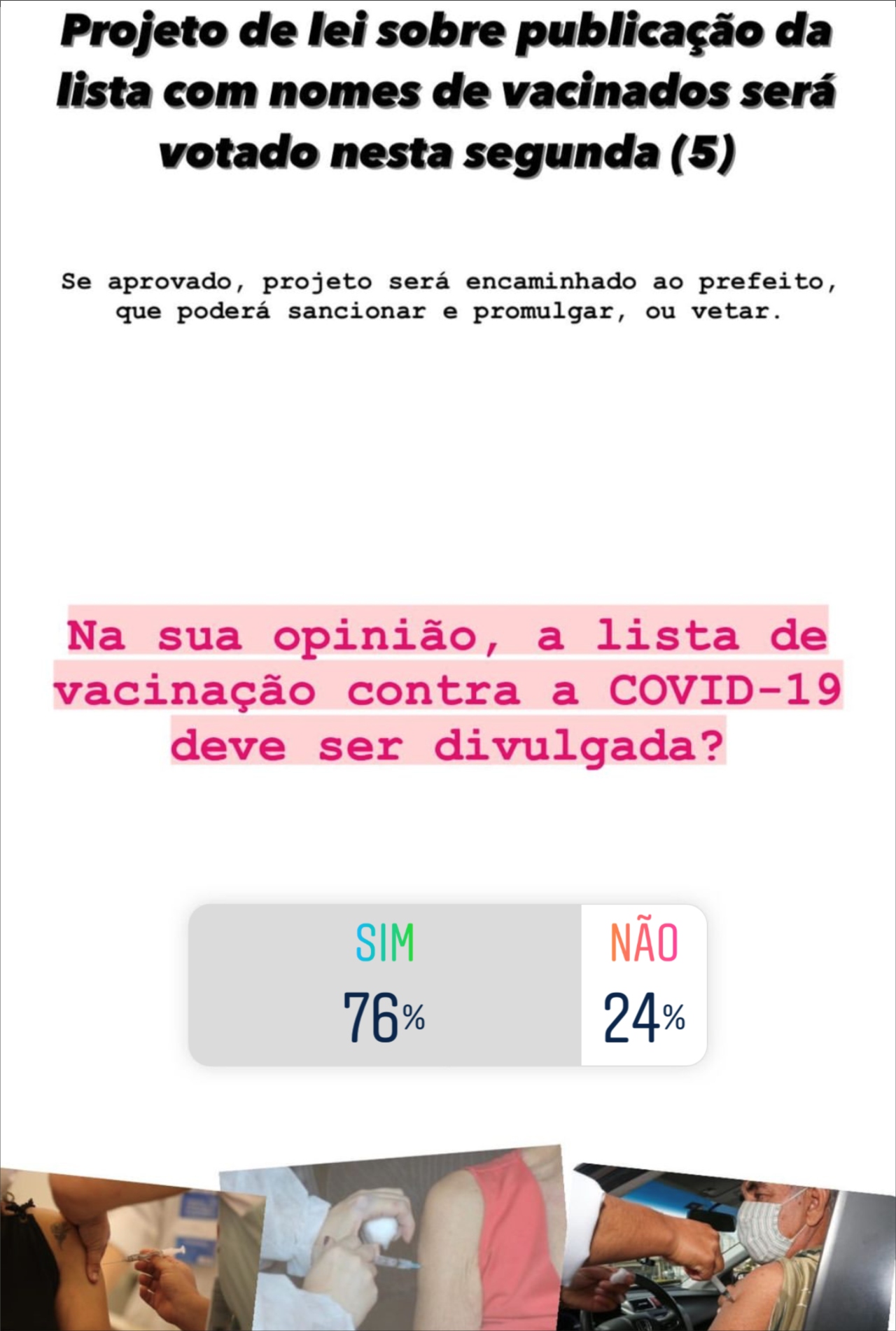 Em uma enquete publicada na tarde desta segunda-feira no perfil do SIGA MAIS no Integram, o portal perguntou aos internautas se a lista de vacinação deve ser divulgada. Pela manhã de hoje (6) a enquete tinha sido visualizada por 3.985 usuários, dos quais 76% responderam que aprovam divulgação e 24% não aprovam.