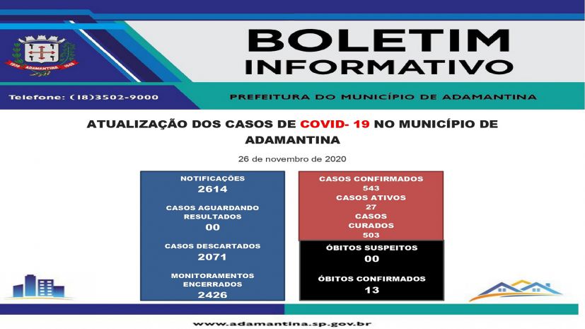 Os dados de internações não são mostrados nos boletins diários divulgados pela Prefeitura de Adamantina. O boletim desta quinta-feira, divulgado depois das 17h, informa que a cidade soma 543 registros da doença, desde o início da pandemia. Desses, há 27 casos ativos, 503 curados e 13 óbitos.