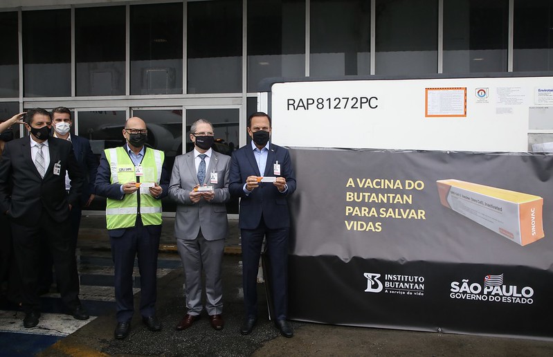 O Governador João Doria participou pessoalmente do recebimento da remessa de 120 mil doses da Coronavac, vacina desenvolvida pelo Instituto Butantan em parceria com a farmacêutica chinesa Sinovac Life Science. A carga, proveniente da China, desembarcou no Aeroporto Internacional de Guarulhos nesta manhã, em um momento histórico diante da gravidade da crise de saúde enfrentada em todo o mundo. O imunizante, que encontra-se na última fase de testes, é considerado uma das esperanças na luta contra a pandemia do coronavírus, que já matou mais de 167 mil de brasileiros e 1,3 milhão de pessoas no mundo todo.