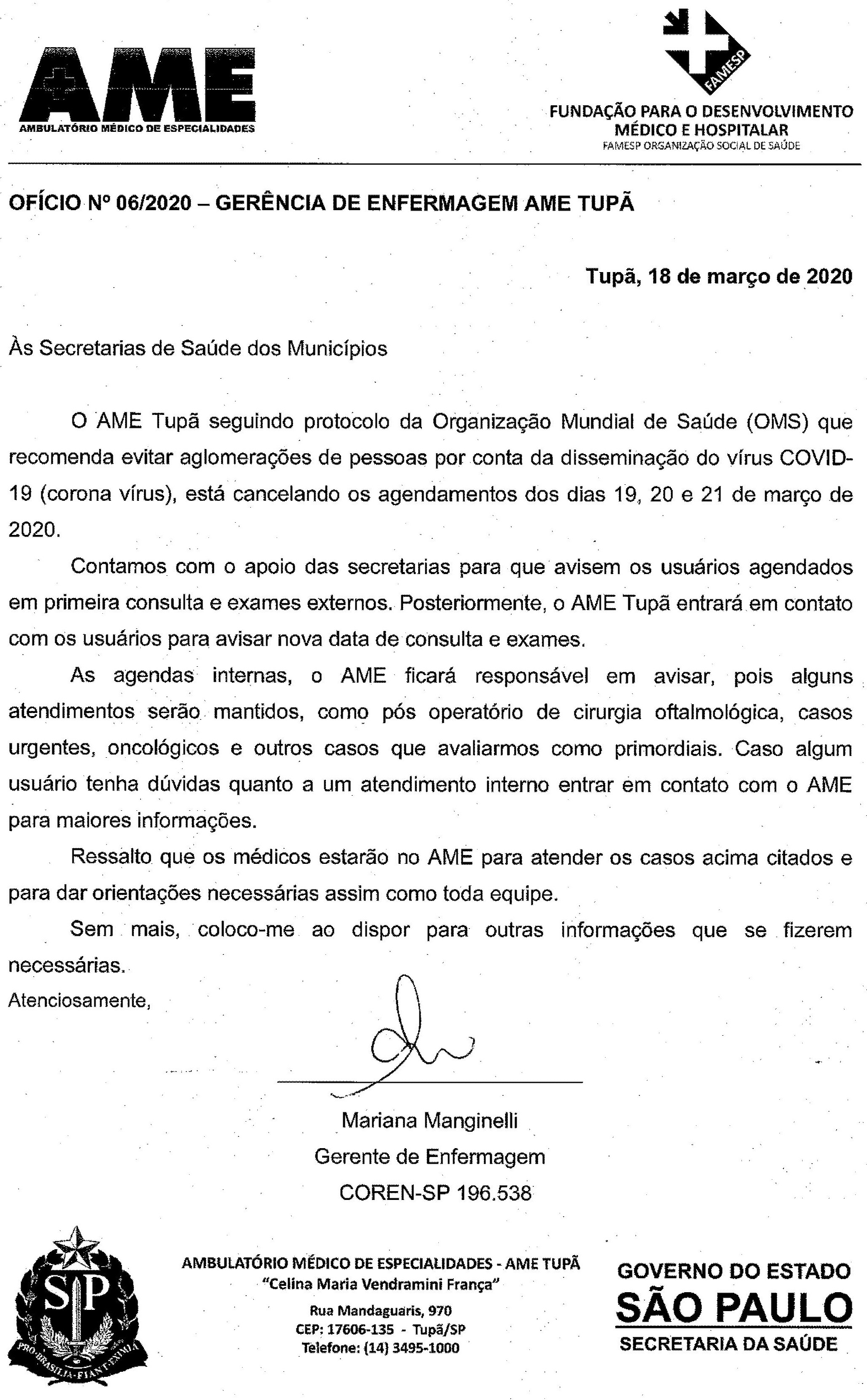 Em comunicado enviado às cidades, a direção do AME Tupã informa que, por conta da grande aglomeração de pacientes e por atender muitos daqueles que estão no grupo de risco, foi decidido no começo da tarde desta quarta-feira (18) pela não abertura do AME nesta quinta (19), sexta (20) e sábado (21).
