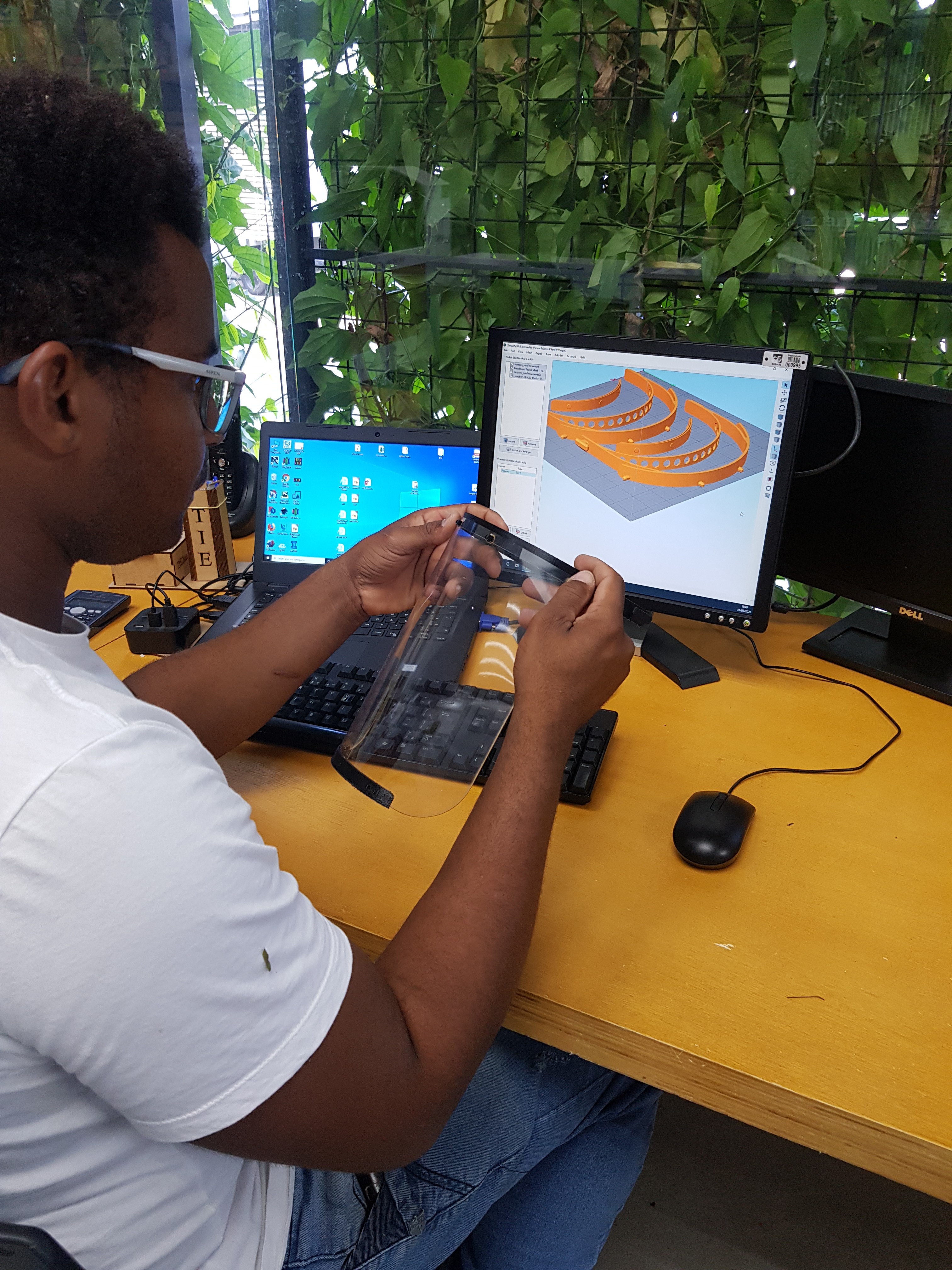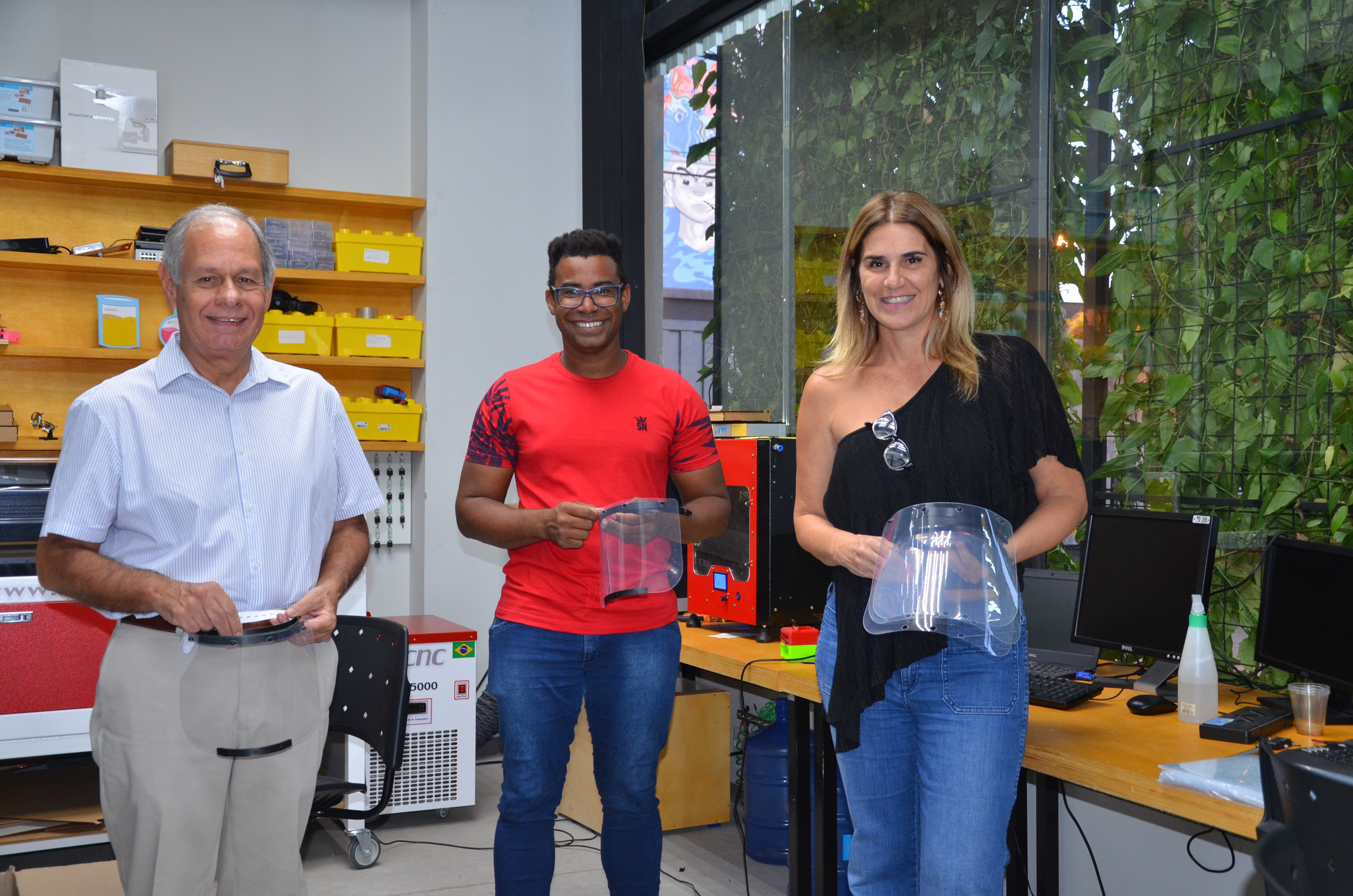 Classificadas como EPI (Equipamento de Proteção Individual), as peças são compostas por uma viseira transparente (acetato), elásticos de fixação e um suporte para cabeça produzido na impressora 3D.