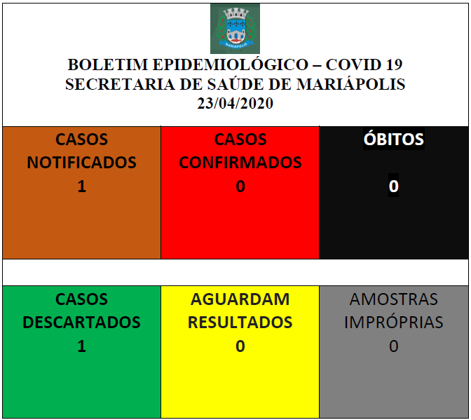O único caso suspeito do novo coronavírus (Covid-19), de moradora de Mariápolis, teve os resultados de exames divulgados nesta quarta-feira (22), informando negativo para a doença, sendo o mesmo descartado. A situação, de alívio para a cidade, consta do Boletim Epidemiológico divulgado nesta quinta-feira (23) pela Vigilância Epidemiológica de Marília. Com esse desfecho, Mariápolis não tem, até hoje (24) nenhum caso suspeito de Covid-19 entre seus moradores.