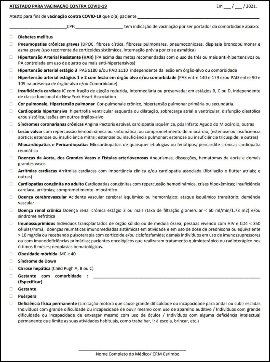 Já as situações que exijam um melhor detalhamento, como hipertensão arterial, por exemplo, que têm diferentes estágios de classificação, entre outras doenças em que o morador não tenha a documentação médica em mãos, os mesmos poderão se dirigir à UBS onde são atendidos e solicitar uma declaração médica (atestado) de que se enquadram em uma das comorbidades, dentro da atual faixa etária autorizada.