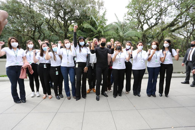 Governador João Dória e um grupo de funcionários do Butantan, hoje cedo (GovSP).