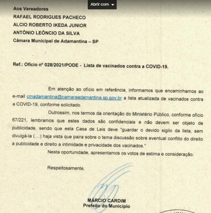 Em paralelo a essa tentativa de tornar obrigatória a divulgação pública da lista de vacinados, os vereadores Alcio Ikeda, Rafael Pacheco e Bigode da Capoeira protocolaram à Prefeitura, no final de janeiro, pedido para ter acesso à relação nominal dos moradores que receberam a imunização, inicialmente negada pelo Poder Público.