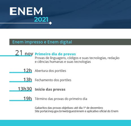 Os portões abrem às 12h e fecham às 13h. Não é permitido entrar após o fechamento dos portões. As provas começam a ser aplicadas às 13h30 e terminam às 19h. O horário é o de Brasília.