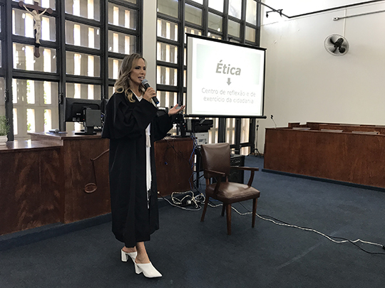 Em sua fala, a juíza Ruth Duarte Menegatti abordou sobre ética, cidadania, direitos e deveres, e a vida em sociedade, sobretudo no tripé escola-família-alunos, destacando também os papeis dos três poderes (Executivo, Legislativo e Judiciário).