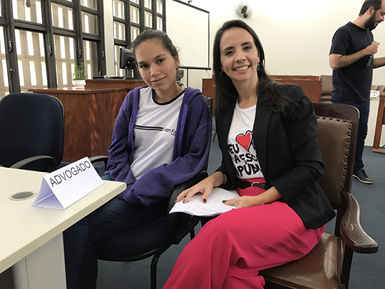 A advogada Simone Alabarse com a advogada mirim, na audiência simulada (Foto: Siga Mais).