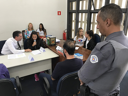 Na audiência simulada e assistida, a juíza mirim e a promotora de justiça mirim colheram depoimentos do adolescente infrator, da professora vítima e de testemunhas, entre as quais, o cabo PM Eudes, da Polícia Militar de Adamantina, também convidado a participar da atividade.