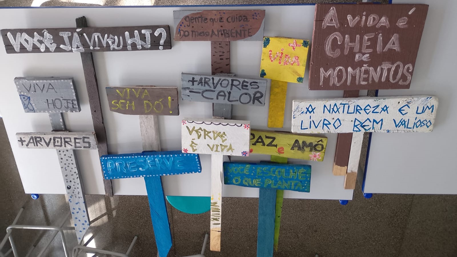 Na ação foram instaladas cerca de 15 plaquinhas ao longo da pista de caminhada do Parque Caldeira. Conforme o professor Tiago, os alunos produziram as placas com frases motivacionais, utilizando madeira de demolição.