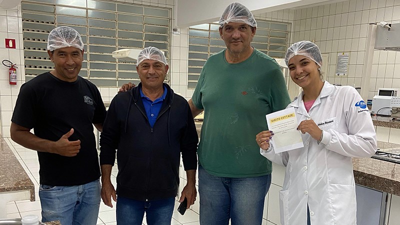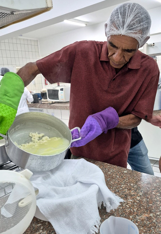 Durante a oficina, os motoristas de ônibus e vans que aguardavam os estudantes no período de aula participaram de um momento de aprendizado sobre a importância do consumo adequado de proteínas nas refeições, além de colocarem a mão na massa preparando queijo cottage, ricota e requeijão de forma prática e acessível.