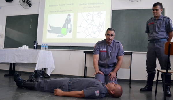 A palestra sobre primeiros socorros foi ministrada pelos bombeiros Marcelo Alvarenga, Vanderlei Galdino de Oliveira e Carlos Eduardo Ebeling, na sala 44 do Bloco IV, no Câmpus II.