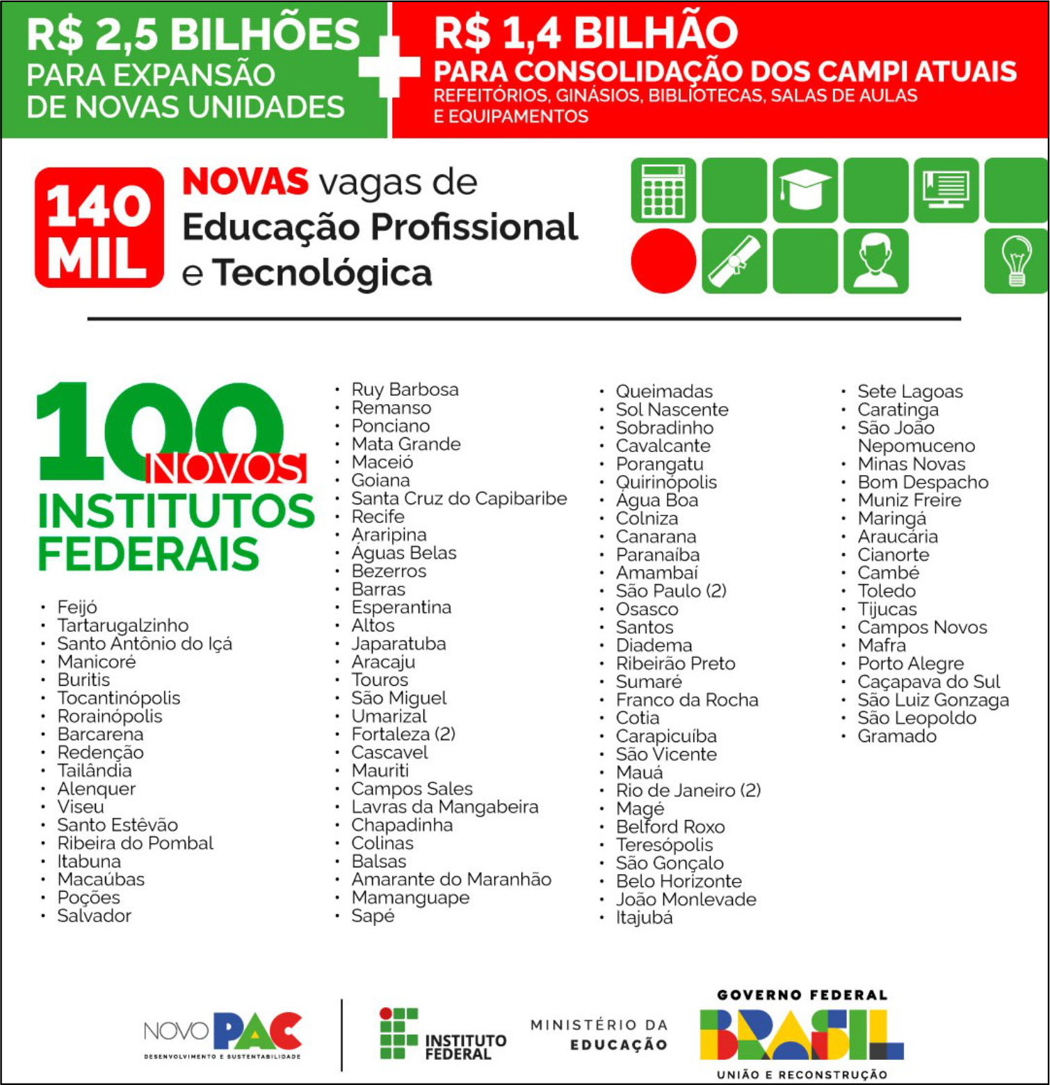 Conforme o governo federal, a criação dos novos institutos vai gerar 140 mil novas vagas, com maioria em cursos técnicos integrados ao ensino médio. Do orçamento total, R$ 2,5 bilhões são para novos campi e R$ 1,4 bilhão para consolidar unidades já existentes, com construção de refeitórios, ginásios, bibliotecas, salas de aula e aquisição de equipamentos.