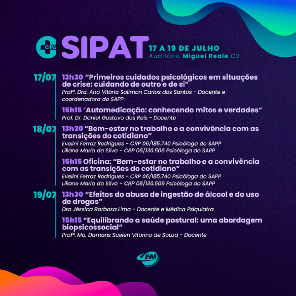 Com foco na saúde mental, a programação prevê duas palestras por dia com um coffee break aos participantes no intervalo entre elas. “Devido ao projeto desenvolvido pelo SAPP voltado à saúde do trabalhador, se tornou nosso parceiro desde a edição do ano passado. Este ano, o SAPP contribuirá com duas palestras e uma oficina: a palestra da quarta-feira, 17, ministrada pela coordenadora do SAPP e docente da instituição, Prof.ª Dra. Ana Vitória Salimon Carlos dos Santos, e a palestra e a oficina do dia 18, ministradas e mediadas pelas psicólogas do SAPP, Evelini Ferraz Rodrigues e Liliane Maria da Silva”, explica o vice-presidente da CIPA gestão 2024/2025, Mateus Vitorelli.