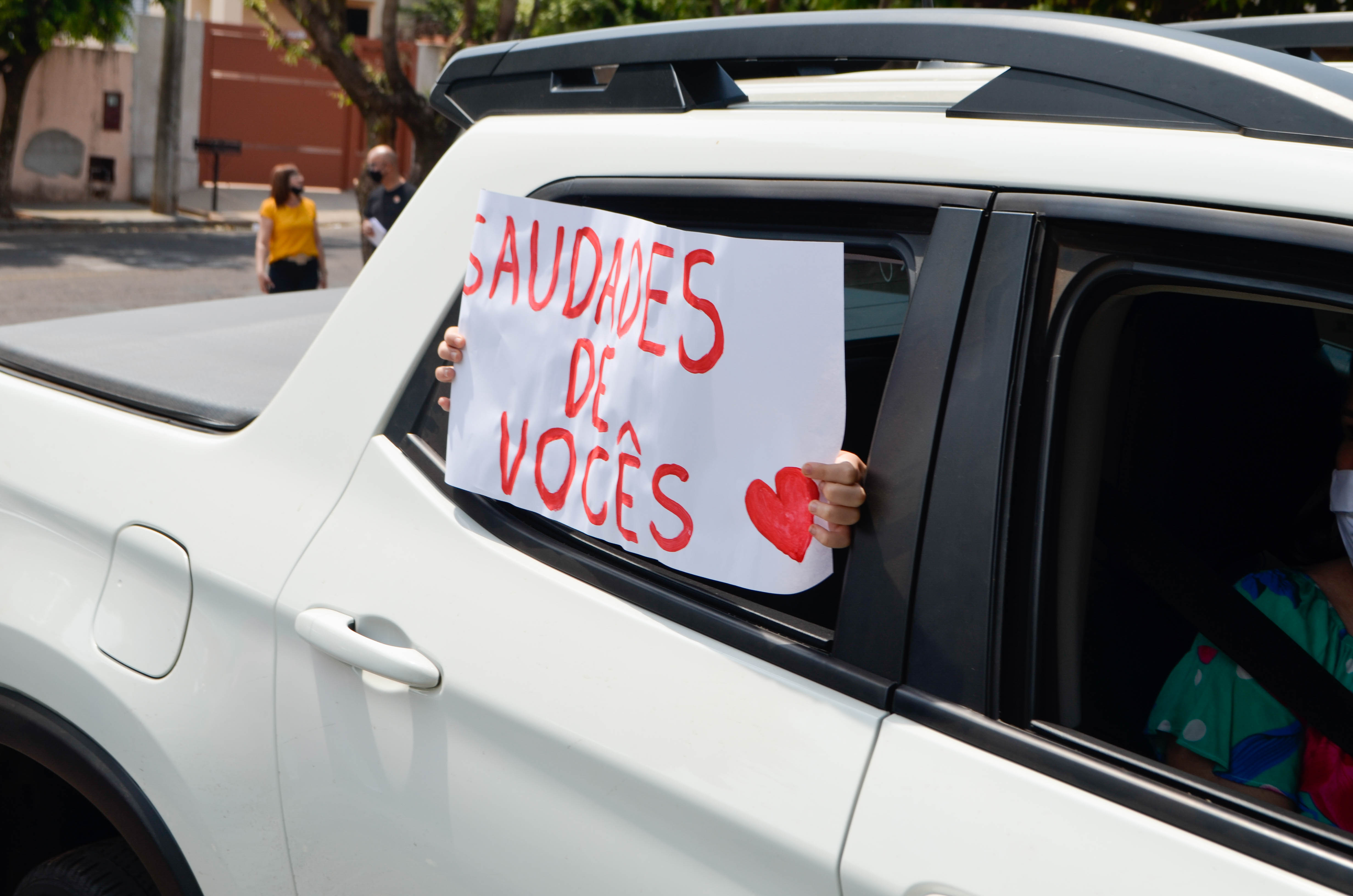 Mobilizada, a equipe escolar preparou um drive-thru para alunos e familiares, onde os professores e funcionários puderam reencontrar os estudantes. Desde março, eles se veem apenas remotamente, nos ambientes virtuais, onde, à distância, mantém o diálogo, a interação e o aprendizado.