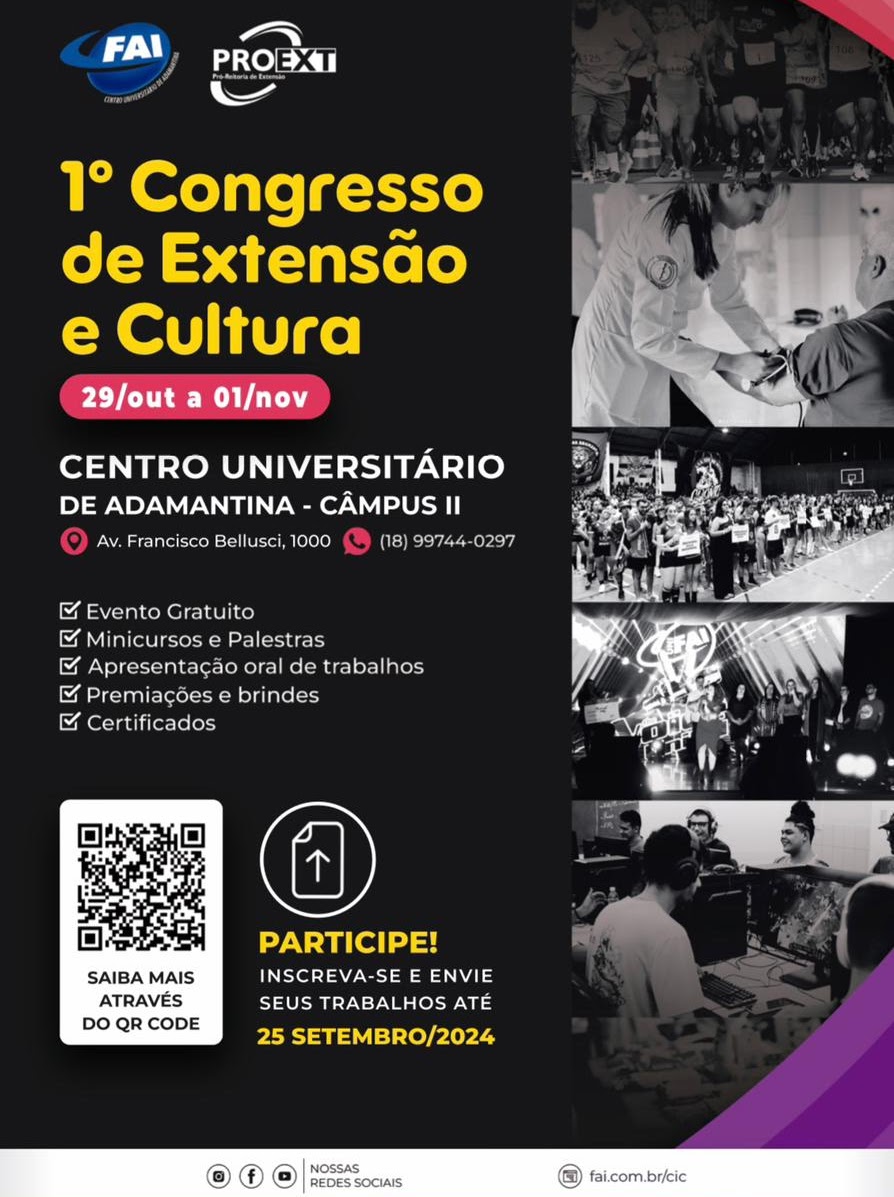 Promovido pela Pró-Reitoria de Extensão (PROEXT), o evento permite o fortalecimento da interação entre universidade e sociedade por meio da articulação entre o ensino, a pesquisa e a extensão. Gratuito, é direcionado a estudantes de graduação, professores, pesquisadores e alunos de pós-graduação da FAI e de outras instituições.
