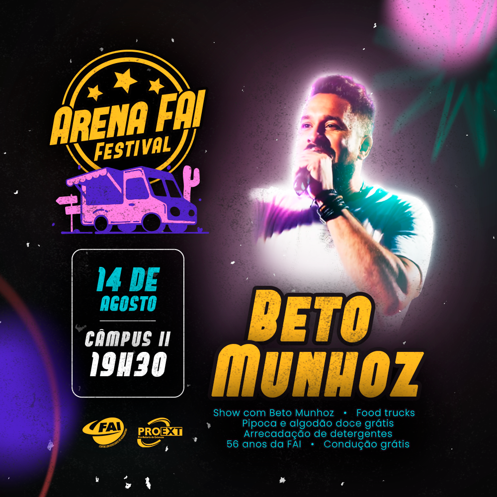 A partir das 19h30 acontece o Arena FAI Festival, no campus II, com ampla praça de alimentação e show com Beto Munhoz. Para as crianças, haverá brinquedos infláveis, pipoca e algodão doce, gratuitamente.