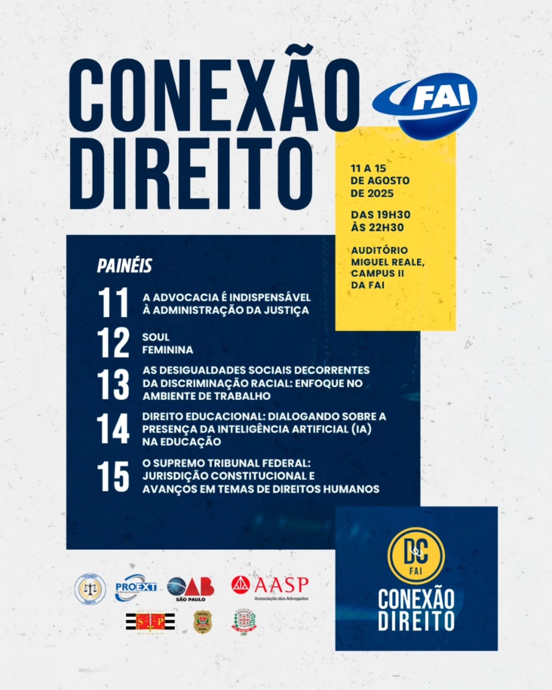 O “Conexão Direito” reafirma o compromisso da FAI com uma formação jurídica crítica, cidadã e alinhada aos desafios do século XXI, oferecendo um espaço de diálogo e troca de experiências entre estudantes, profissionais e a sociedade.
