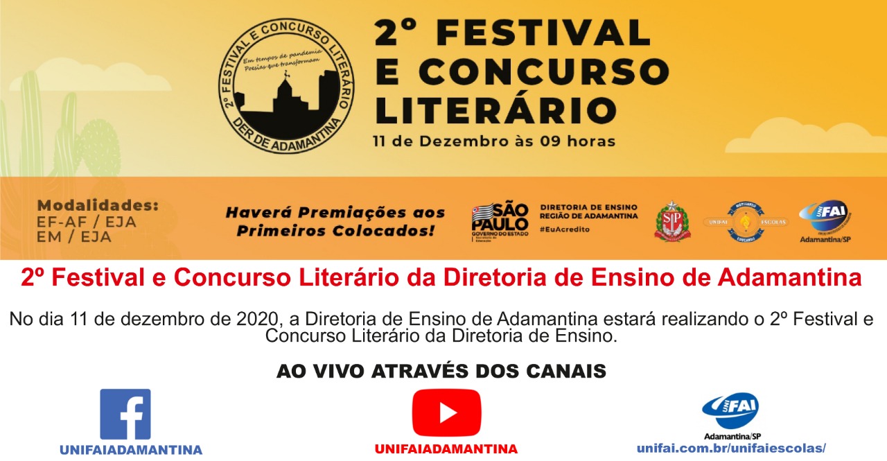 A final do Festival e Concurso Literário acontece em ambiente virtual, e terá transmissão pelas redes sociais da UniFAI, a partir das 9h de sexta-feira (11), na página da UniFAI no Facebook, em seu canal no Youtube e também no link www.unifai.com.br/unifaiescolas.
