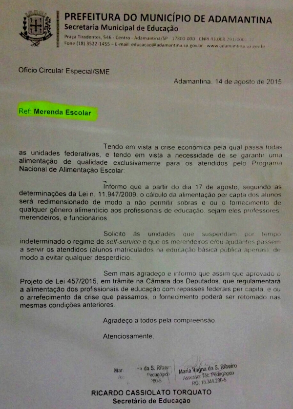 O documento da Secretaria Municipal de Educação de Adamantina cita a Lei 11.947/2009, que fixa e padroniza o cálculo da alimentação per capta dos alunos, e diz que haverá um redimensionamento, “de modo a não permitir sobras e ou o fornecimento de qualquer gênero alimentícios aos profissionais da educação, sejam eles professores, merendeiros e funcionários”, diz.