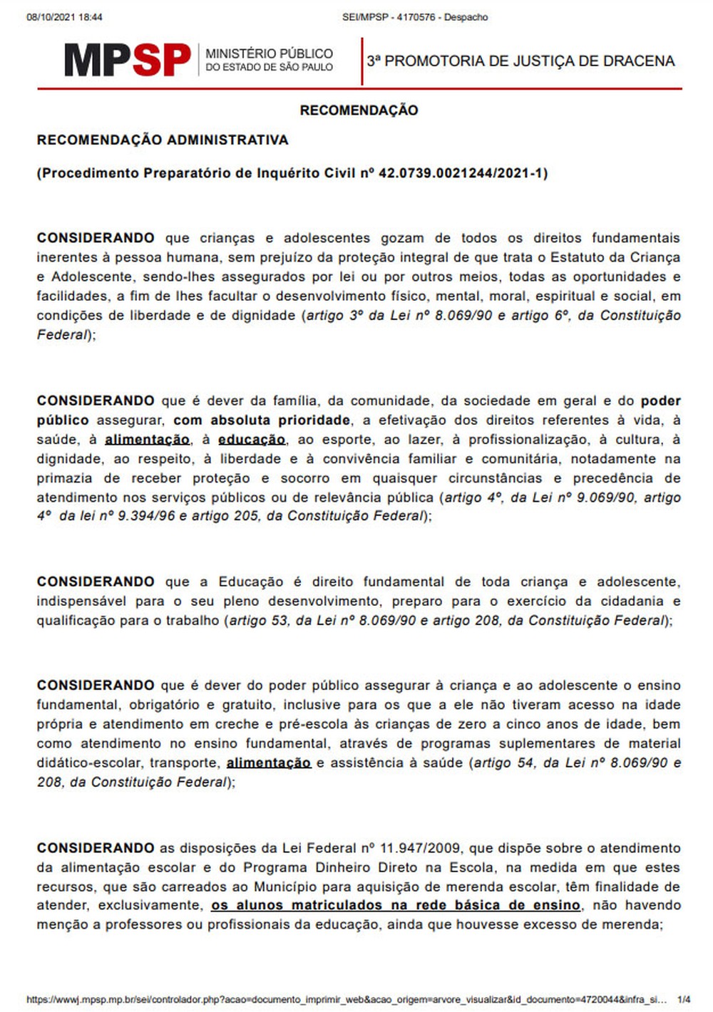 Íntegra: recomendação do Ministério Público, em Dracena