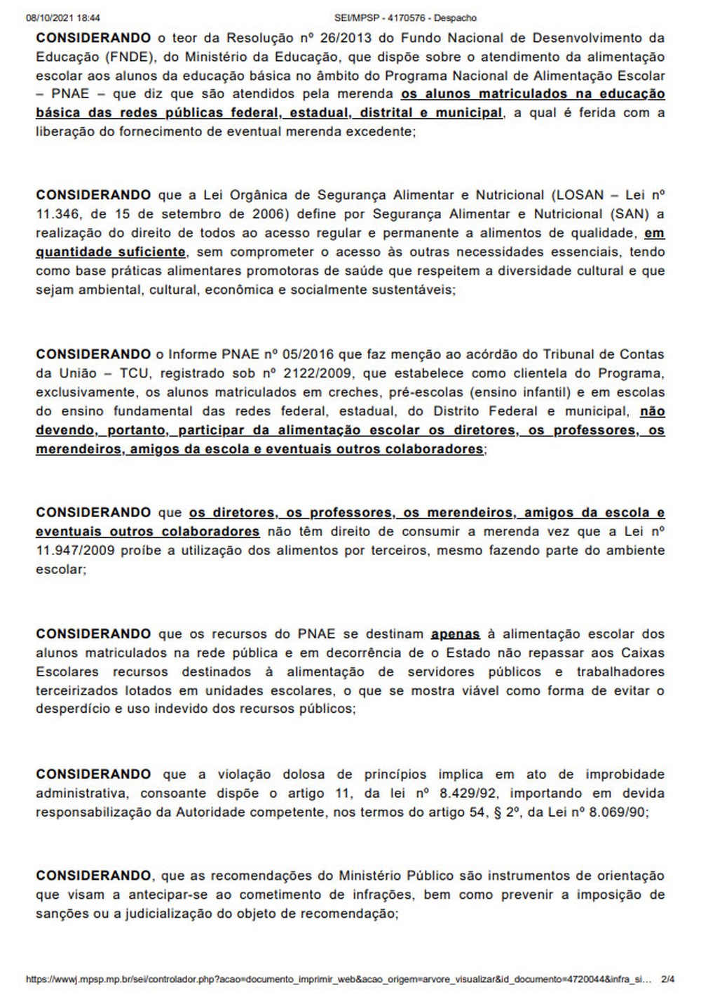 Em suas considerações, o promotor de justiça destaca que os insumos para a merenda escolar são adquiridos com recursos para esse programa, com a finalidade exclusiva de promover a alimentação dos estudantes, não havendo na legislação menção a professores ou profissionais da educação, ainda que houvesse excesso de comida