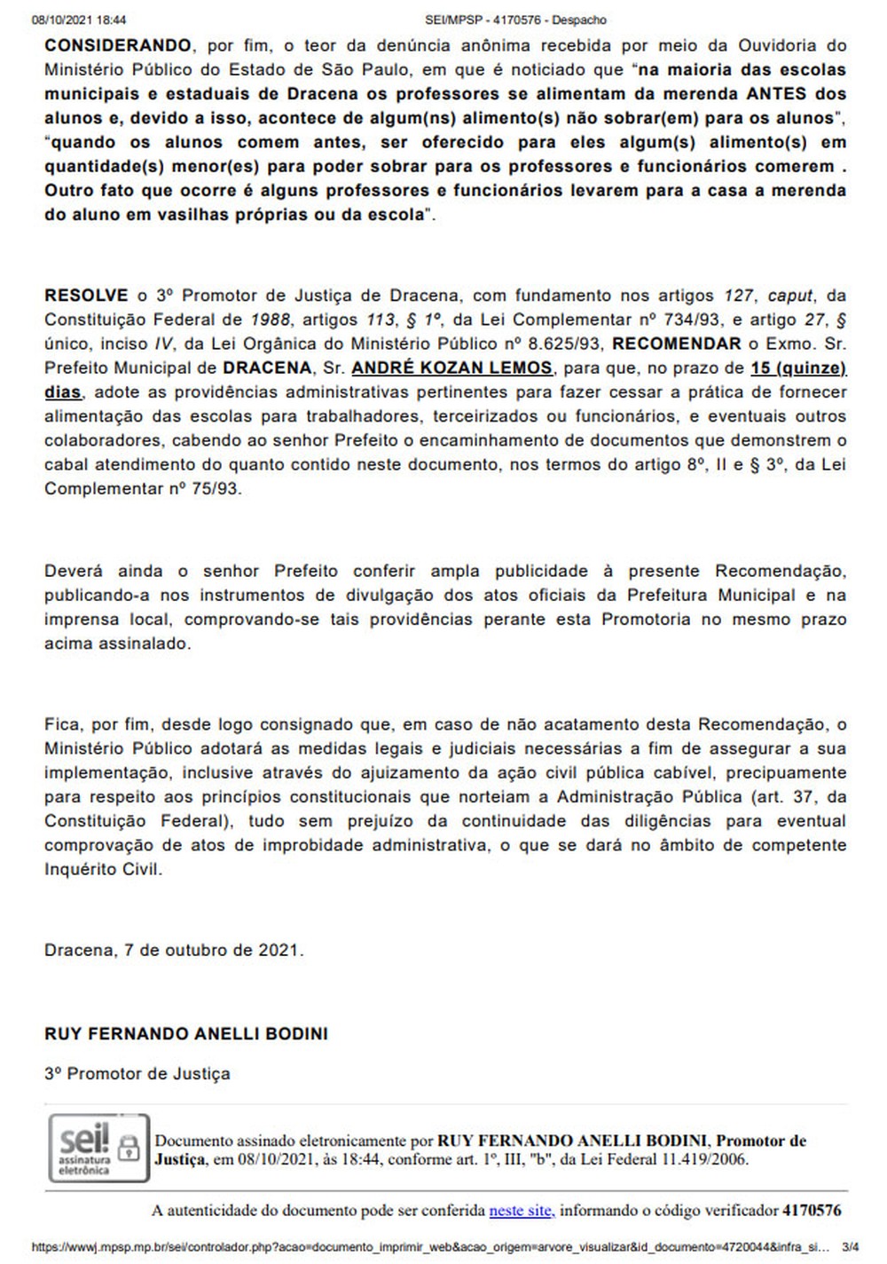 Veja três imagens com a íntegra da recomendação do promotor de Justiça Ruy Fernando Anelli Bodini, do Ministério Púbico do Estado de São Paulo, à Prefeitura de Dracena: