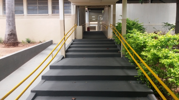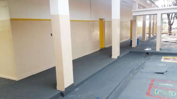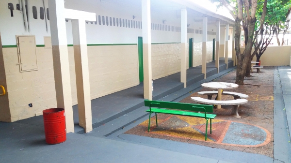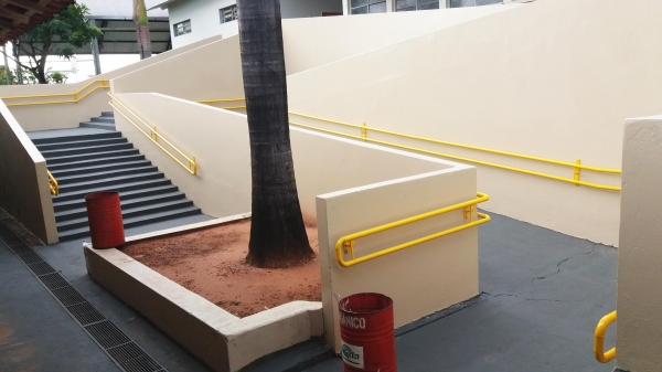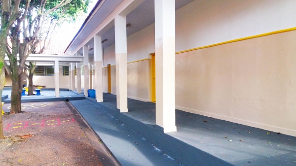 As entradas, o pátio, as escadas, rampas, portas e paredes das áreas externas receberam nova pintura, trazendo vivacidade aos espaços de convivência comum dos alunos na volta às aulas.