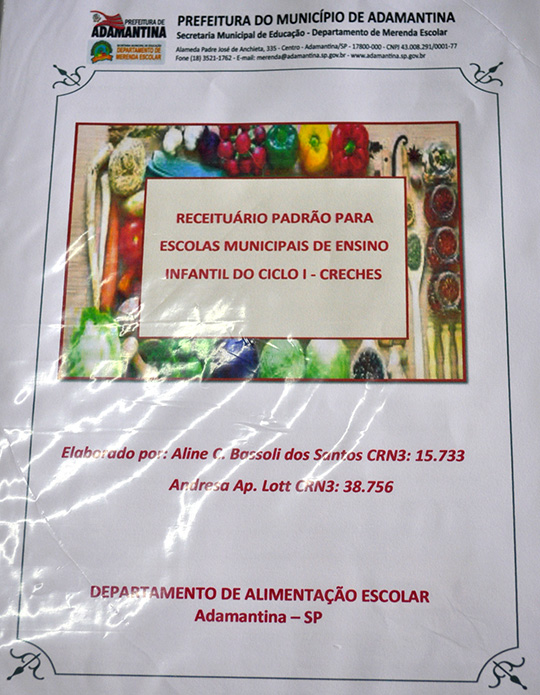 O Departamento de Alimentação Escolar de Adamantina confeccionou o receituário padrão. Essa é uma ferramenta necessária para uso das merendeiras, pois auxilia no planejamento e execução das preparações estabelecidas no cardápio, evitando assim o desperdício ou a falta de padrão nas receitas.