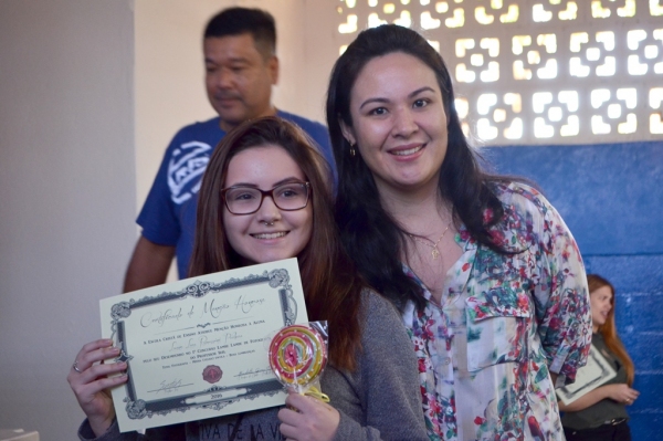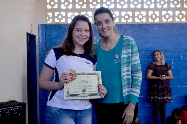 Pelo ensino fundamental II, foram premiados Ana Elisa Martins Ruiz (9º ano), Larissa Silva de Cinque Natal (9º ano) e Bruna Bordinhon Pegorari (9º ano).