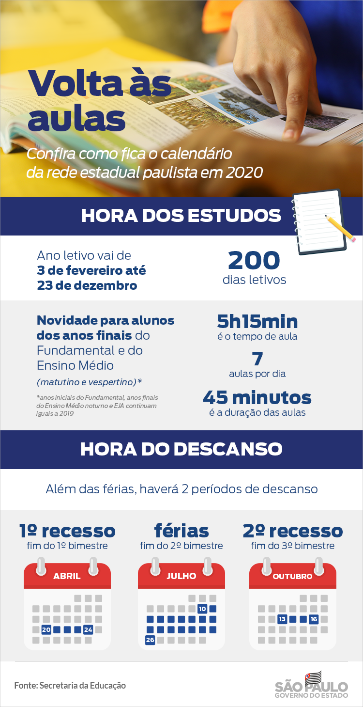 As escolas estaduais atuarão sob um novo modelo de calendário, com mais períodos de recesso, sendo um ao final do primeiro bimestre e outro no terceiro bimestre. As férias do segundo e do quarto bimestre ficam mantidas.