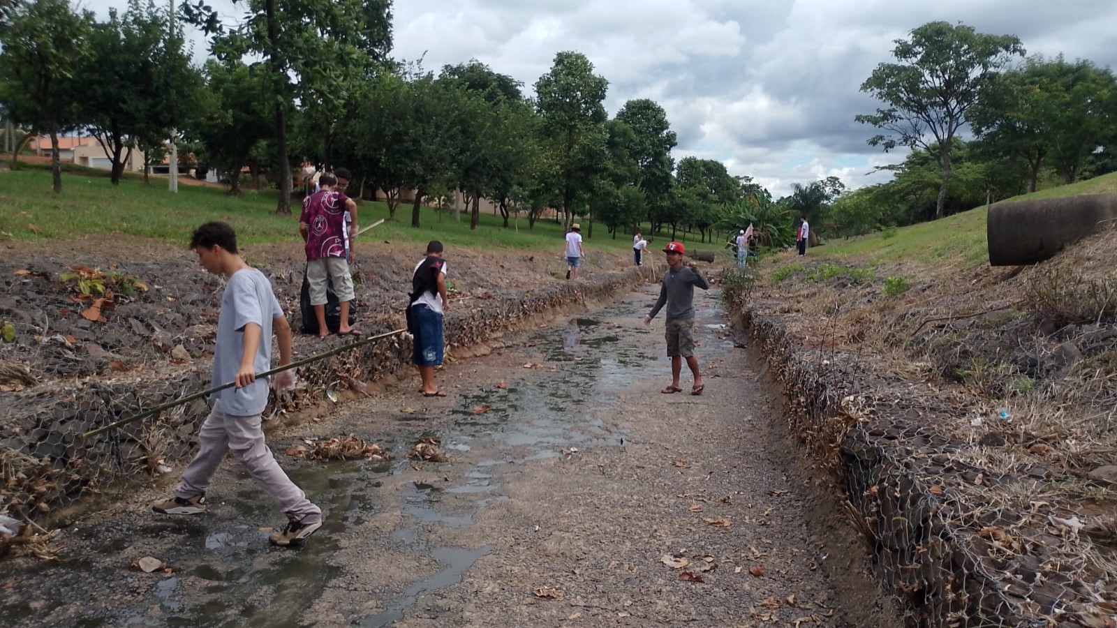 Córrego Caldeira atravessa o parque público. Estudantes fizeram limpeza às margens do canal.
