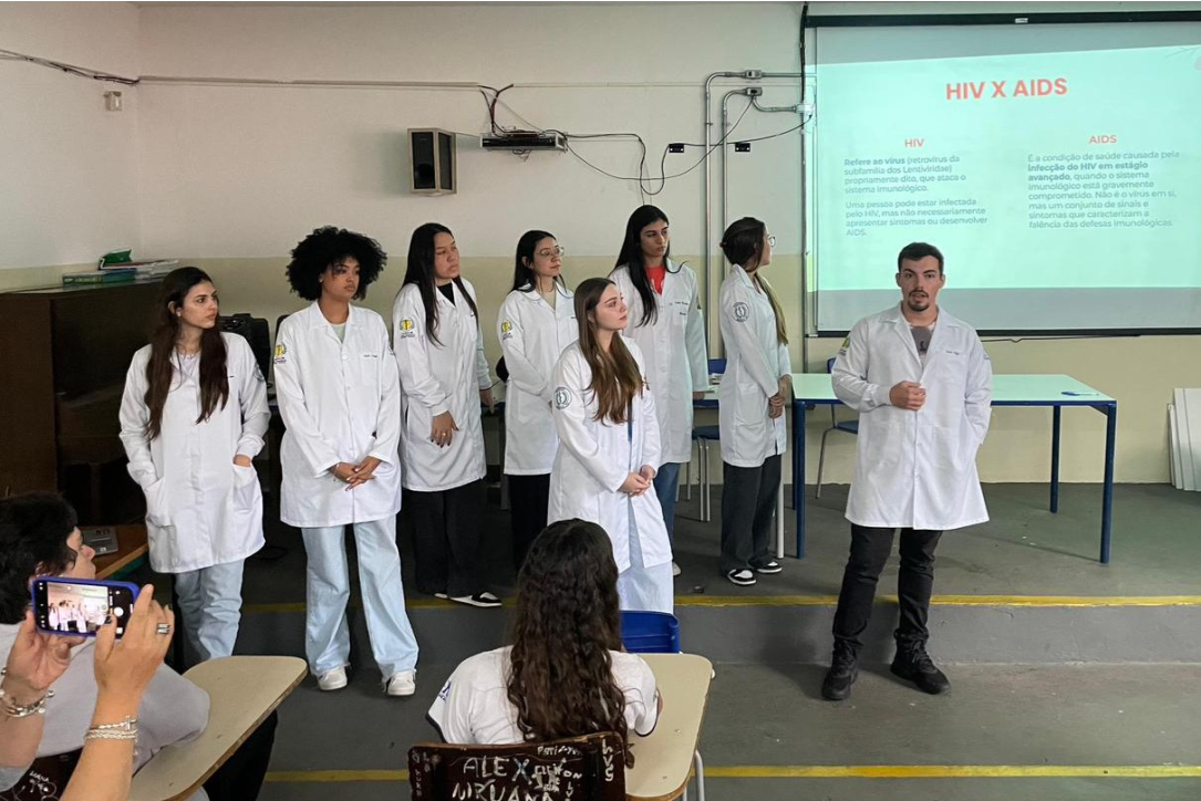 Em outra frente, um segundo grupo do curso realizou uma atividade educativa na Escola Estadual Helen Keller, abordando as principais infecções sexualmente transmissíveis (ISTs) entre jovens, como HIV e sífilis. Os estudantes explicaram formas de transmissão, prevenção e tratamento, destacando a importância do uso de preservativos, distribuídos gratuitamente pelo Sistema Único de Saúde (SUS).