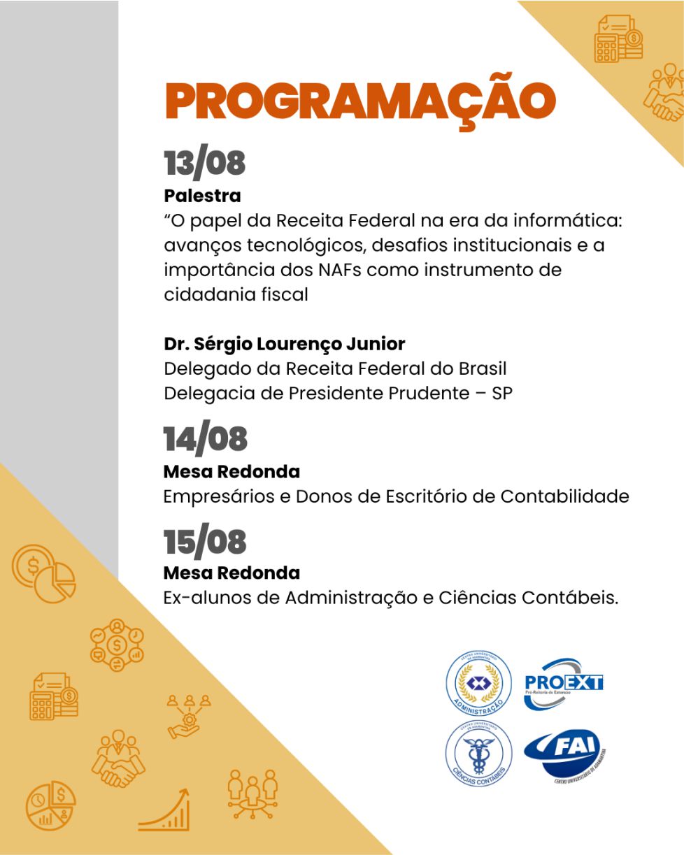 - 15/08 (sexta-feira): Mesa redonda com ex-alunos dos cursos de administração e ciências contábeis, que compartilharão experiências e trajetórias profissionais após a graduação.