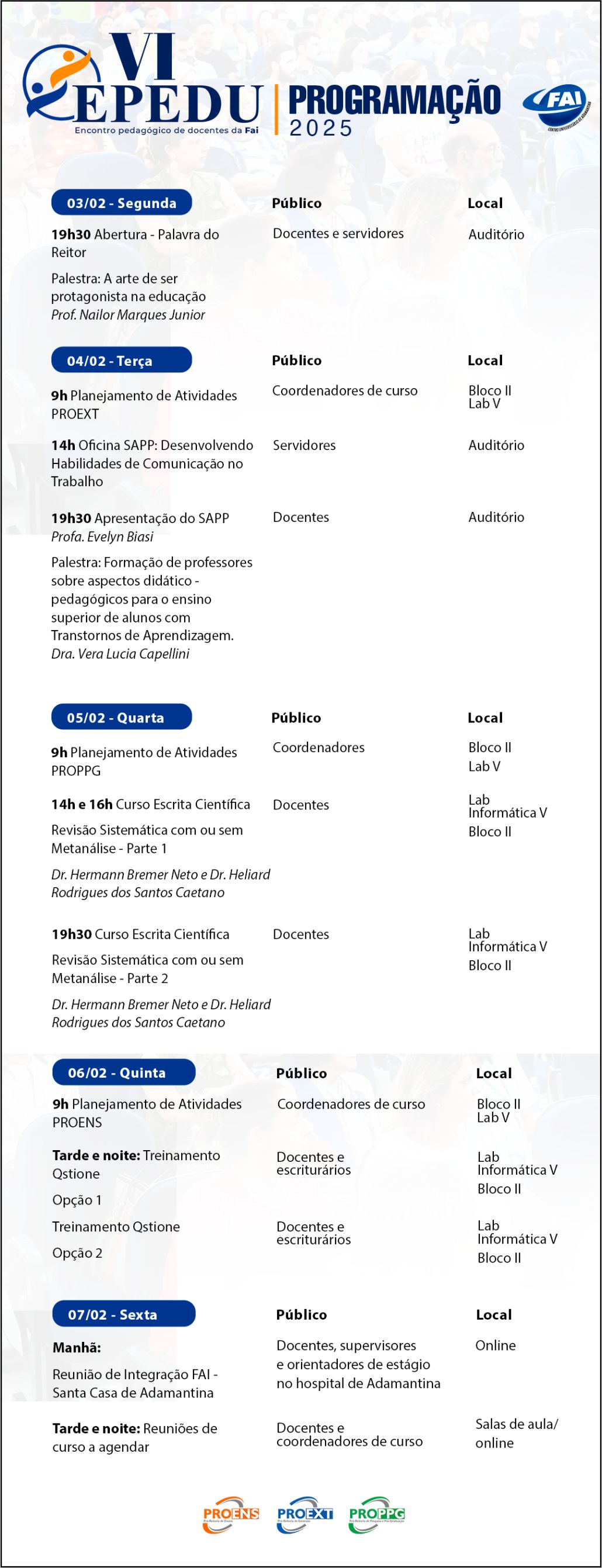 A fim de intensificar as atividades de capacitação e planejamento do Centro Universitário de Adamantina, de 3 a 7 de fevereiro, as pró-reitorias de Ensino (PROENS), Pesquisa e Pós-Graduação (PROPPG) e Extensão (PROEXT) promovem o V Encontro Pedagógico para Docentes 2025 (V EPEDU).