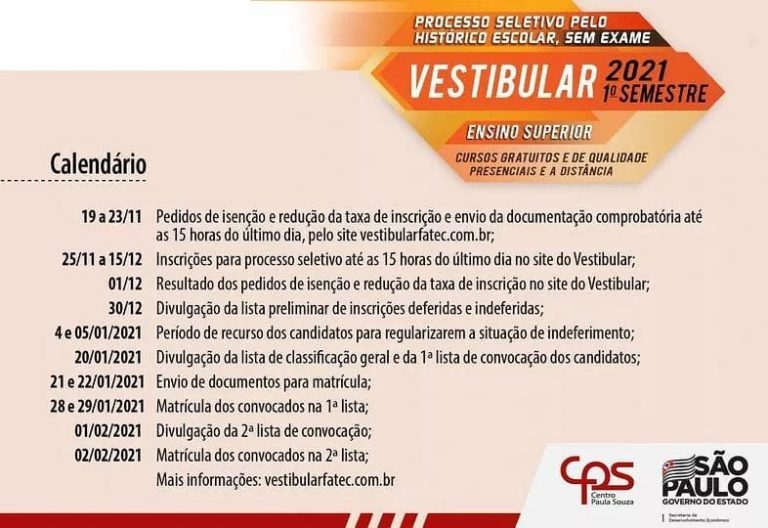 O processo seletivo das Faculdades de Tecnologia do Estado (Fatecs) está com inscrições abertas a partir desta quarta-feira (25) até 15 de dezembro, exclusivamente pelo site vestibularfatec.com.br – no último dia, o prazo vai até 15 horas. O valor da taxa de inscrição é de R$ 39. O vestibular para o primeiro semestre de 2021 será por análise de histórico escolar, sem prova presencial ou online.