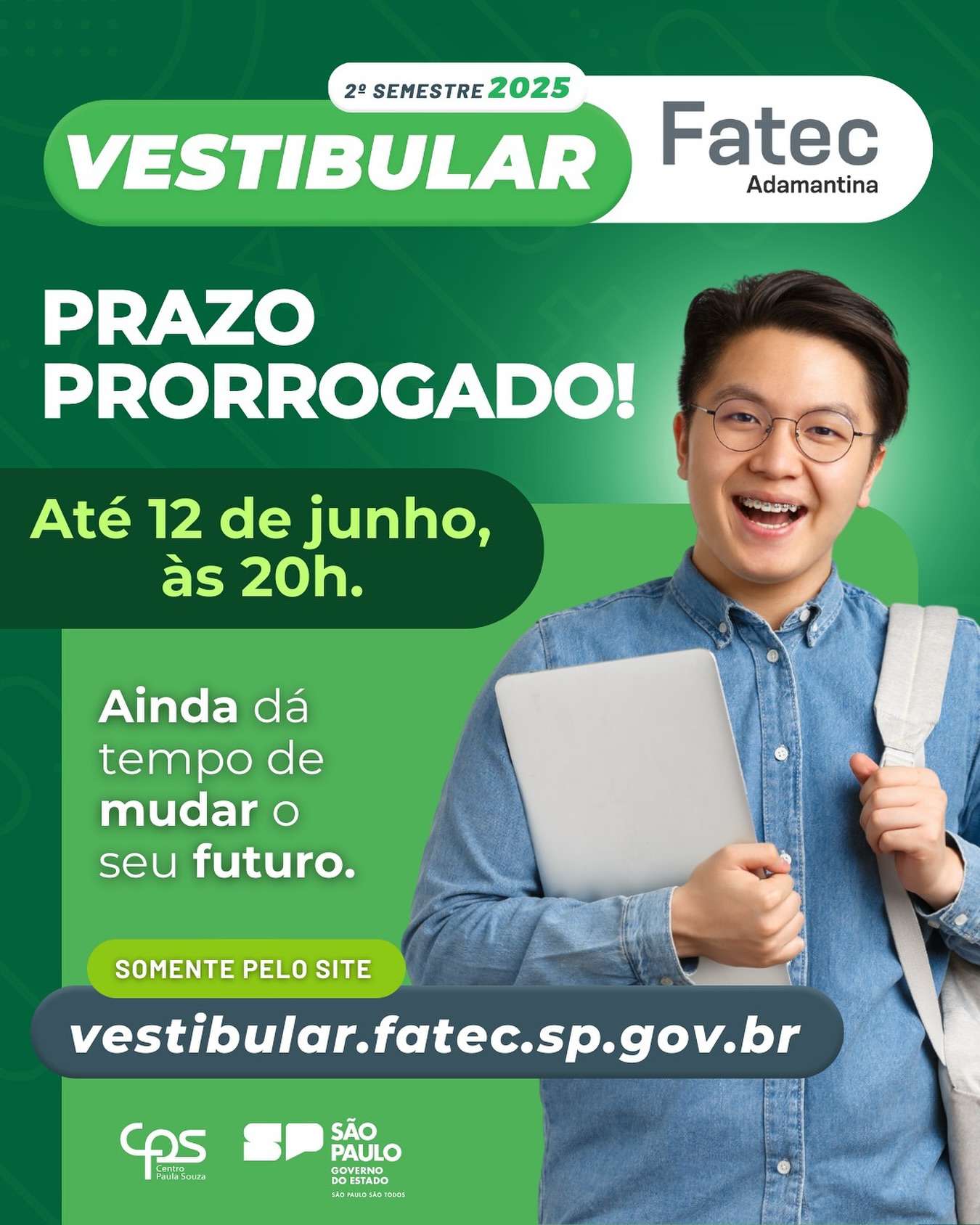 O candidato do processo seletivo das Faculdades de Tecnologia do Estado (Fatecs) para o segundo semestre de 2025 ganhou mais tempo para se inscrever. O prazo de encerramento das inscrições foi prorrogado até quinta-feira (12), às 20 horas. A prova será aplicada em 29 de junho. Em Adamantina a Fatec oferece dois cursos superiores: ciência de dados e gestão comercial. O ensino é gratuito.