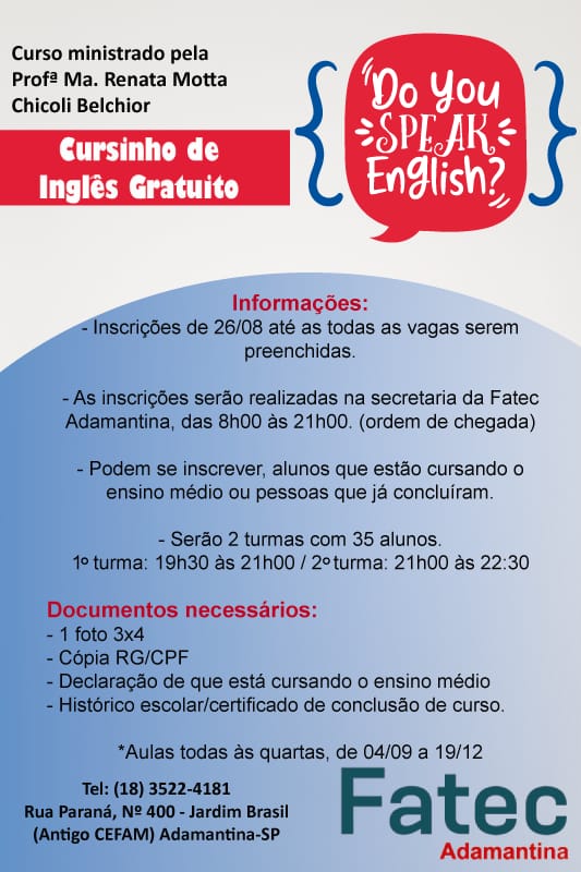 A Fatec Adamantina abriu nesta segunda-feira (26) as inscrições para dois cursinhos, gratuitos, dirigidos à comunidade: informática básica e inglês. Para ambos, as vagas serão preenchidas de acordo com a ordem de inscrição.
