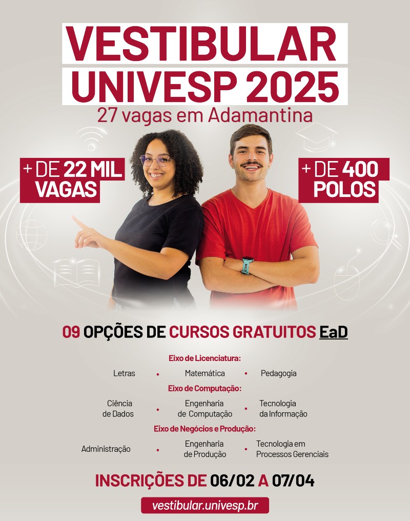 As inscrições para o vestibular 2025 da Univesp estão abertas. Os interessados tem até às 23h59 do dia 7 de abril para efetivar o interesse por meio do site vestibular.univesp.br.