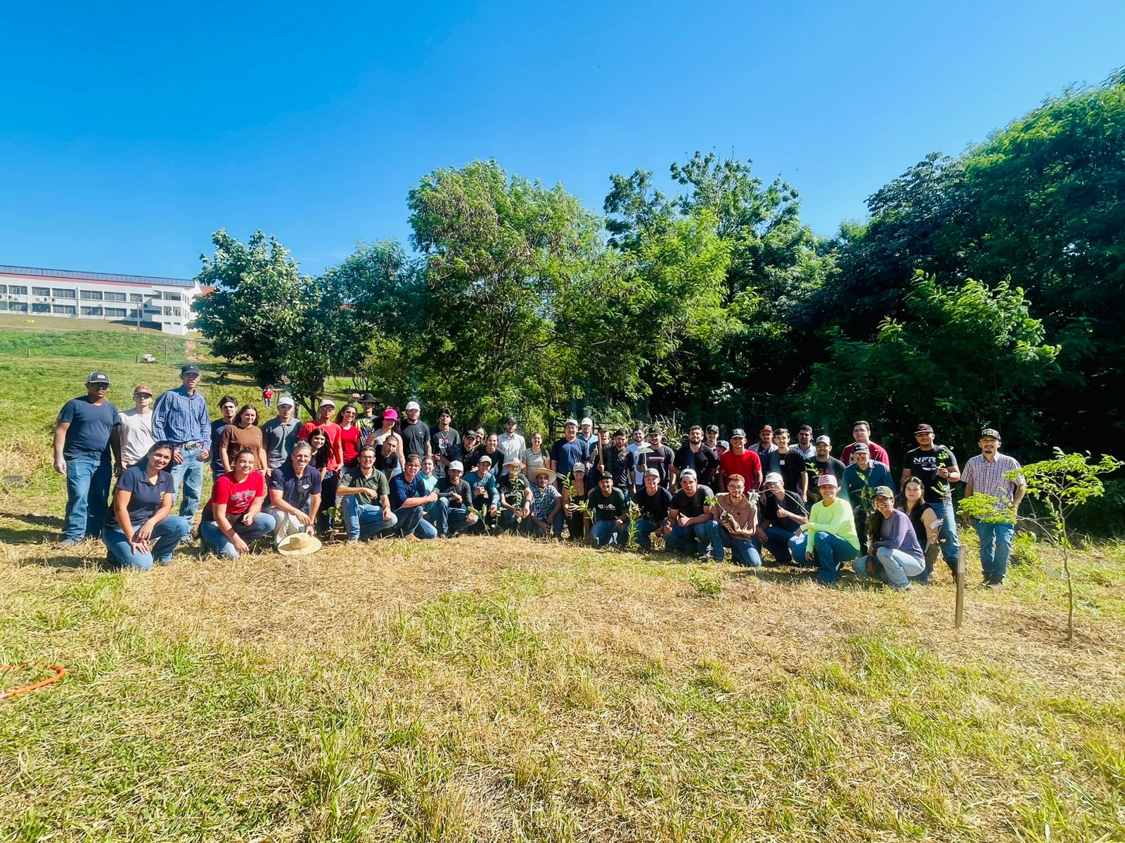 Entre as espécies introduzidas na área estão ipês, aroeira, angico, cabreúva, peroba-rosa, pau-ferro, ingá, jatobá e embaúba — árvores de reconhecida importância ecológica, fundamentais para a recomposição da vegetação nativa e para a promoção da biodiversidade local.