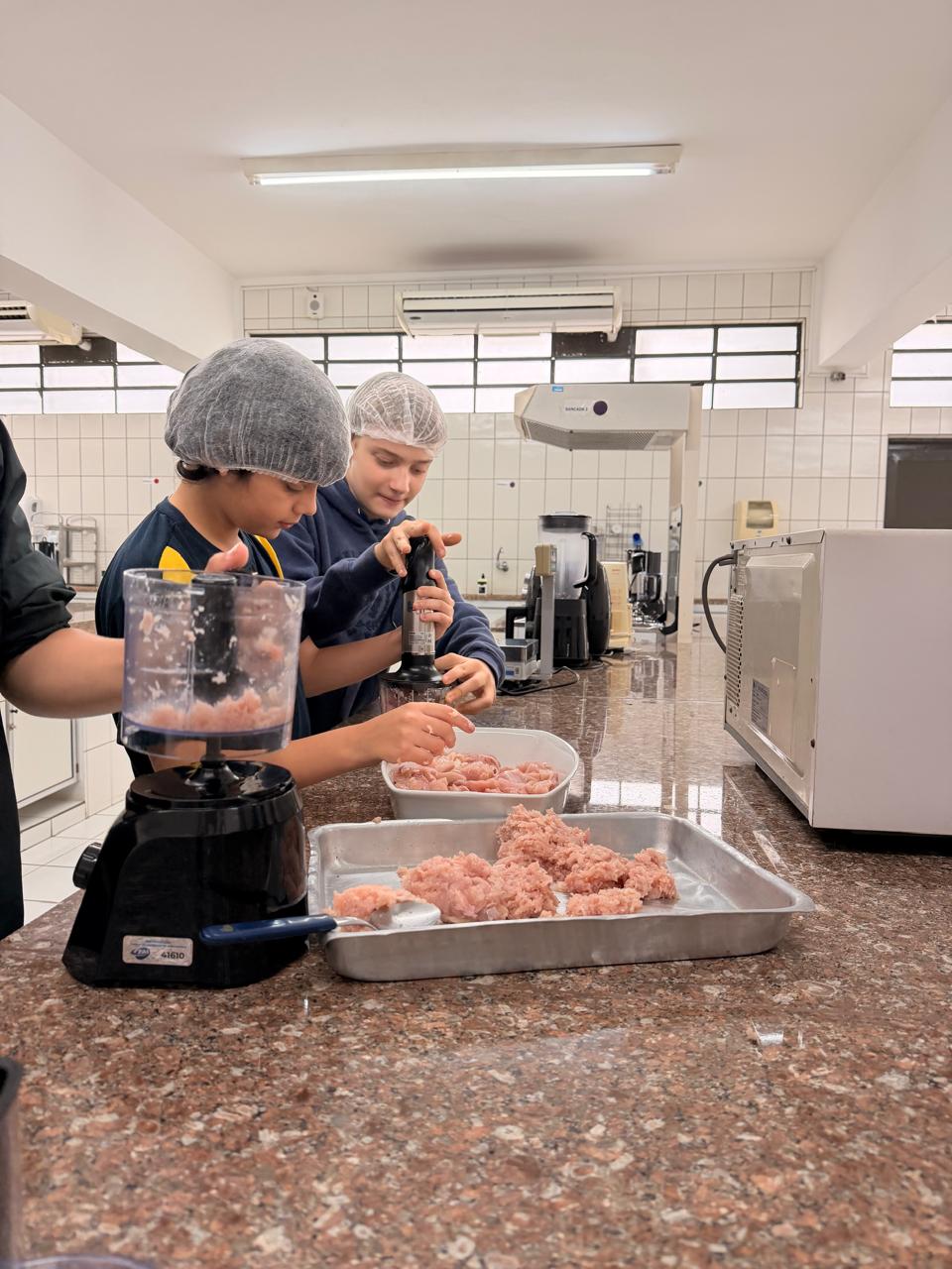 Para consolidar o aprendizado, a segunda etapa ocorreu no laboratório de técnica e dietética da FAI. Os alunos do ensino fundamental foram recebidos para uma oficina prática onde puderam "colocar a mão na massa". Sob supervisão, eles aprenderam a preparar opções mais saudáveis, como nuggets e molho de tomate. Ao final, a turma participou da degustação das próprias receitas, unindo o viés lúdico à educação nutricional.